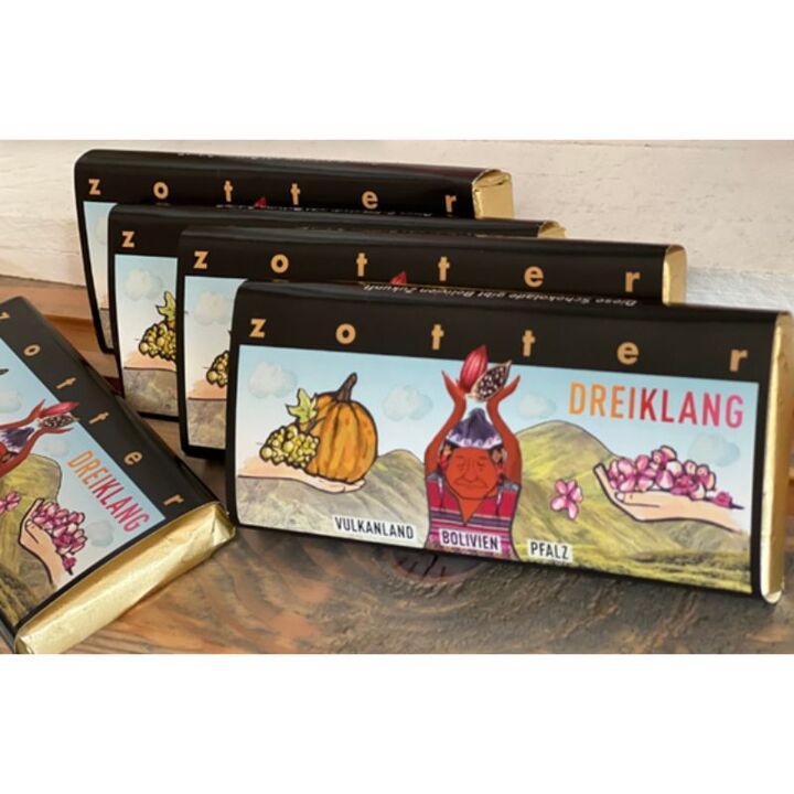 Die Zotter-Schokolade „Dreiklang“ stammt aus der österreichischen Manufaktur Zotter, die für hochwertige Bio-Schokoladen und fairen Handel bekannt ist.