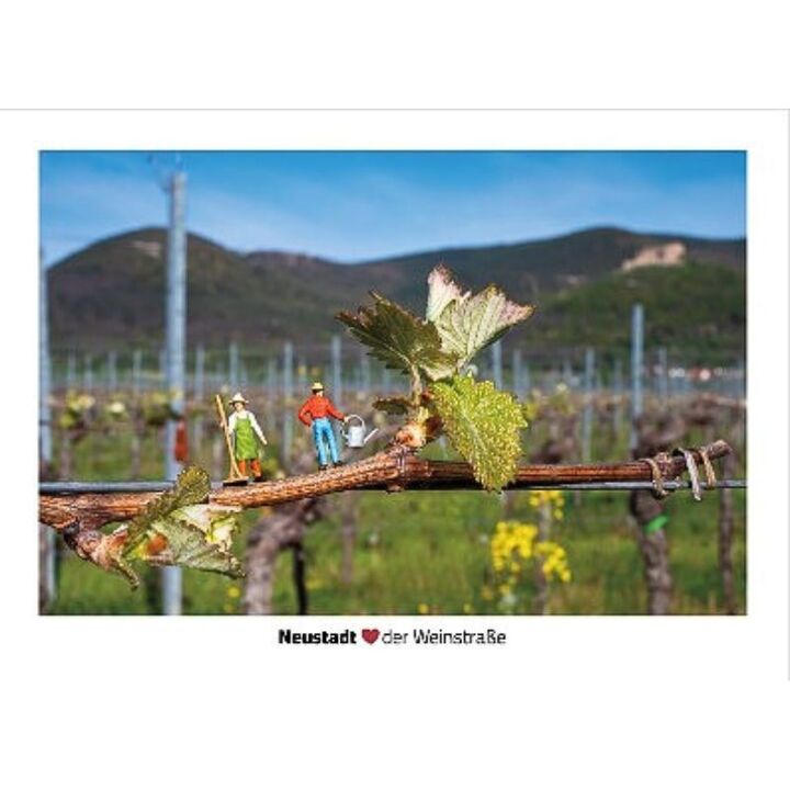 Die Karten zeigen witzige und originelle Szenen aus Neustadt an der Weinstraße, in denen Miniaturfiguren, kaum größer als zwei Zentimeter, an bekannten Orten der Stadt inszeniert werden.